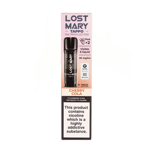 The Tappo Cherry Cola Prefilled Pods are designed for use with the Lost Mary Tappo only. Enjoy the vibrant caramel and citrus tones of fizzy cola melded with rich dark cherries.
