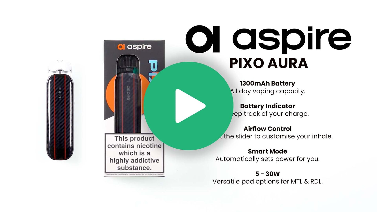 The Aspire Pixo Aura Pod Kit is a versatile refillable device for MTL, RDTL and DTL vaping. It uses a built in 1300mAh battery and Smart Mode to deliver up to 30W of power, adjusting the wattage automatically to suit the pod you use. Inhale activation keeps operation simple. You just fill the pod, adjust the airflow and inhale to vape.