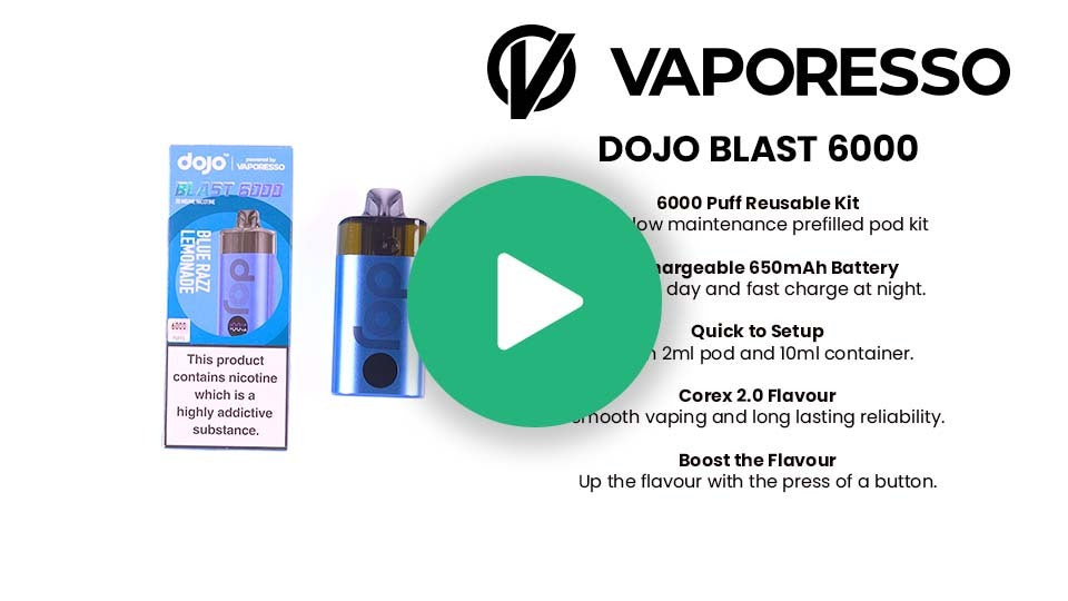 The Vaporesso Dojo Blast 6000 is a TPD-compliant prefilled pod kit built for long, low-effort sessions. It pairs a 2ml prefilled pod with a 10ml refill container to deliver up to 6,000 puffs in total. A rechargeable 650mAh battery keeps you going through busy days, while COREX 2.0 mesh technology helps the coil heat quickly and evenly for clean, consistent flavour. Designed for a smooth MTL vape with 20mg nic salt, it also includes a Boost button for a stronger hit when you want it.