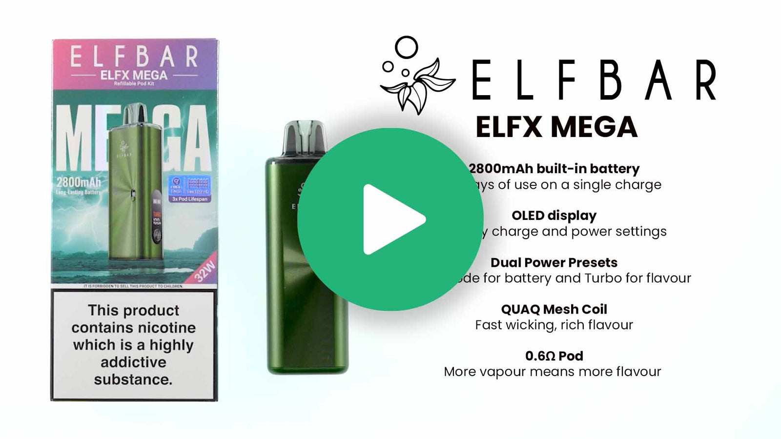 Included with the ELFX Mega is a 2ml refillable pod (TPD compliant) with a built-in 0.6Ω dual mesh coil. Refilling is quick and clean thanks to the top/side fill design, and it’s designed to work especially well with 50/50 nic salts like ELFLIQ.