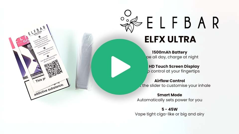 Level up your vaping game with the Elf Bar Elfx Ultra Pod Kit, the ultimate upgrade from the Elfx Pro. Crafted to cater to both beginners and seasoned vapers, this versatile refillable pod kit packs a powerful 1500mAh built-in battery with variable wattage up to 45W, delivering outstanding performance whether you’re into MTL, RDTL, or DTL vaping styles. With a 2.4” touchscreen display, rapid 2A charging, and compatibility with the full range of ELFX replacement pods, the Elfx Ultra offers unmatched customisation and convenience in a sleek, compact design. Should we delve deeper?