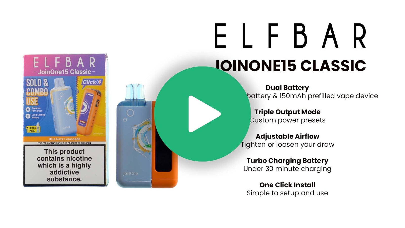 The JoinOne15 Classic features a dual-battery setup combining a 1000mAh external device with a 150mAh Mini-Unit, an HD display, adjustable airflow, and three power modes for a fully customisable vape.