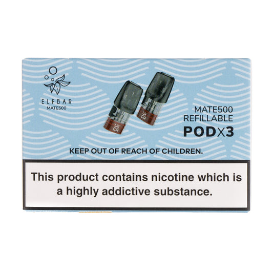 A pack of 3 replacement Mate 500 refillable pods for the ELF Bar Mate 500 re-chargeable pod kit. Each refillable pod has a 2ml pod capacity and is compatible with high PG e-liquids. The ELF Bar Mate 500 is suitable for mouth to lung vapers who prefer modest amounts vapour over a cloudy exhale.