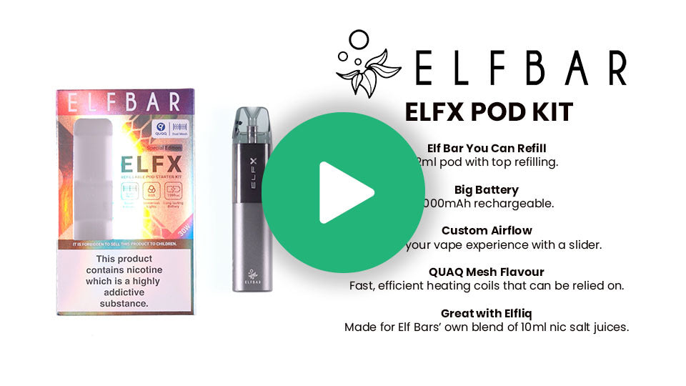 The Elf Bar ELFX is the first refillable and rechargeable pod kit from vaping icons Elf Bar. This streamlined kit is equipped with a huge 1000mAh battery and 30W of variable power. Precise airflow adjustment and a QUAQ Dual Mesh Coil to deliver mouthwatering flavour and a smooth MTL (mouth to lung) style vape. This 30W kit is perfect for lovers of disposable vapes who wish to transition to an economical and easy-to-use refillable kit or anyone looking to upgrade their vaping game.
