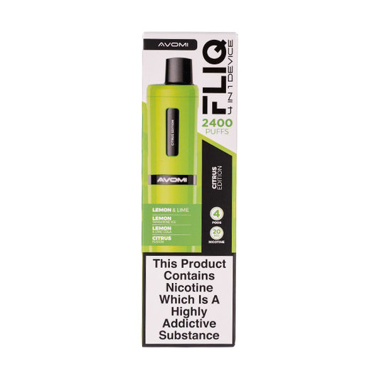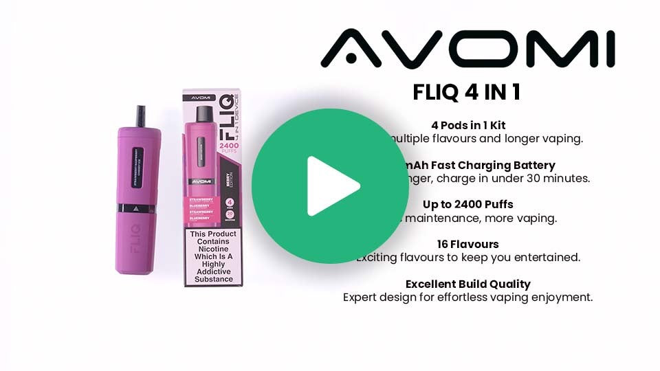 Vape more for longer with the Avomi Fliq 4 in 1, a prefilled pod kit that uses 4 x 2ml pods fitted into a rotating chamber. Enjoy up to 2400 puffs and mix up flavours so you never get tired. The Fliq Pod Kit has a 950mAh battery and showcases outstanding build quality that makes using it a joy. Each pod is filled with 20mg of nicotine salts - ensuring great flavour and smooth satisfaction of the strongest nicotine cravings.