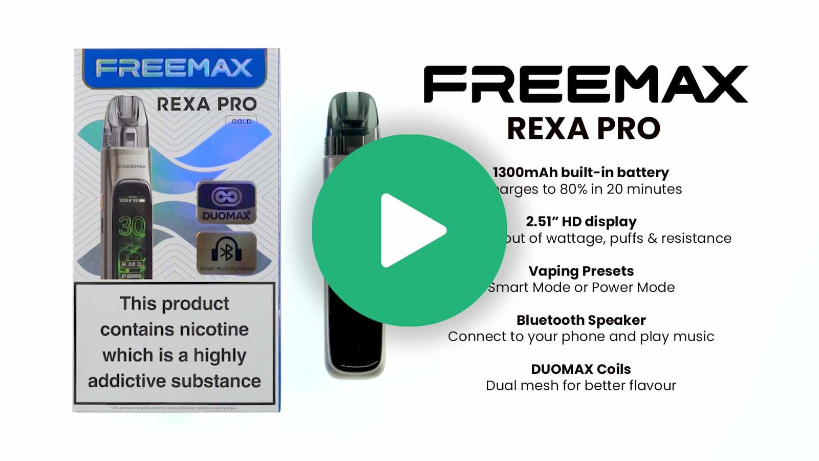 The Freemax Rexa Pro Pod Kit is an excellent choice for those seeking a compact device that delivers a powerful performance. This smart pod kit features a built-in 1300mAh battery with up to 30W output, smart and power mode, Bluetooth connectivity, a 2.51" HD touchscreen display, and comes with two pods, one standard Rexa Pod and one DUOMAX Pod, giving you flexibility and enhanced flavour and vapour production. Shall we jump into some more detail?