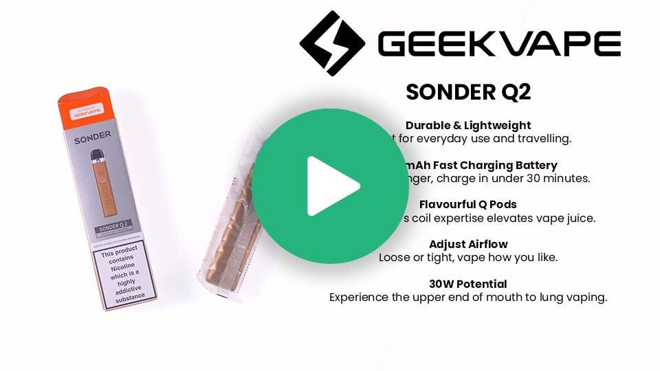 The Geek Vape Sonder Q2 is a refillable pod kit designed for smooth MTL or RDTL vaping with nic salts or 50/50 e-liquids. Featuring a robust 1350mAh battery, adjustable airflow, and up to 30W of power, it delivers enhanced flavour and cloud production in a slim, durable aluminium body. Fully compatible with the Geek Vape Q Cartridge range, it’s a dependable and user-friendly choice for both new and experienced vapers.