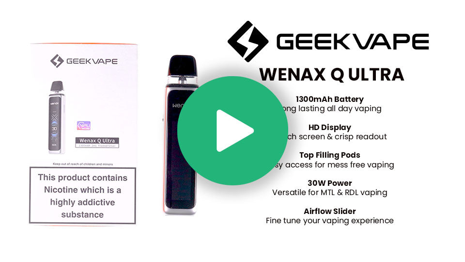 Introducing the Geek Vape Wenax Q Ultra Pod Kit, a feature rich pod kit that is great for beginners and advanced vapers. It has a 1300mAh battery that can quickly be refuelled via an included Type-C cable. This stylish and modern pod vape kit also powers up to a substantial wattage of 30W, uses dual activation, has a dazzling HD OLED display and is compatible with all Wenax Q Pods. Let's delve into some more detail.