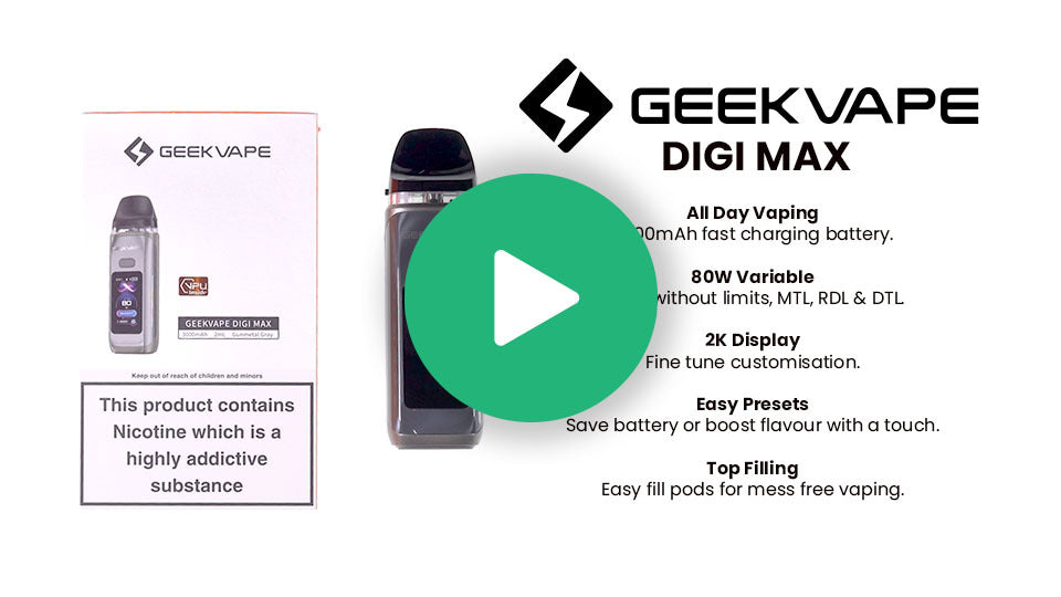 Introducing the Geekvape Digi Max Pod Kit, a great pod kit for those looking for a versatile experience. With a built-in 3000mAh rechargeable battery that powers up to 80W, adjustable airflow and the ability to support MTL, RDTL and DTL vaping, this pod kit is truly a no-brainer. With an intelligent chipset and enhanced pod performance, the GeekVape Digi Max redefines what a compact vape can do.
