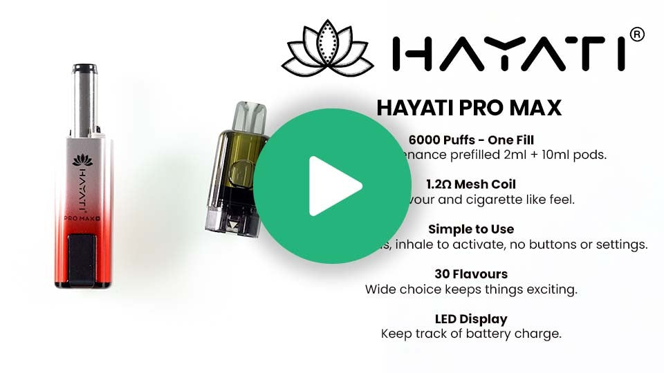 The Hayati Pro Max 6000 is a prefilled MTL pod kit designed for longer use with simple day to day operation. It pairs an 850mAh rechargeable battery with a 2ml pod and built in 10ml refill cartridge, giving you up to 6000 puffs from each setup.