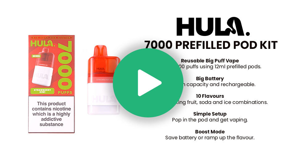 The Hula 7000 Prefilled Pod Kit is a compact rechargeable MTL device that uses a replaceable 2ml prefilled pod and 10ml refill container to deliver up to 7,000 puffs per setup. It is built around a 950mAh battery, dual mesh coil pod and 20mg nic salt e liquid, which together provide a smooth cigarette style draw with clear flavour.