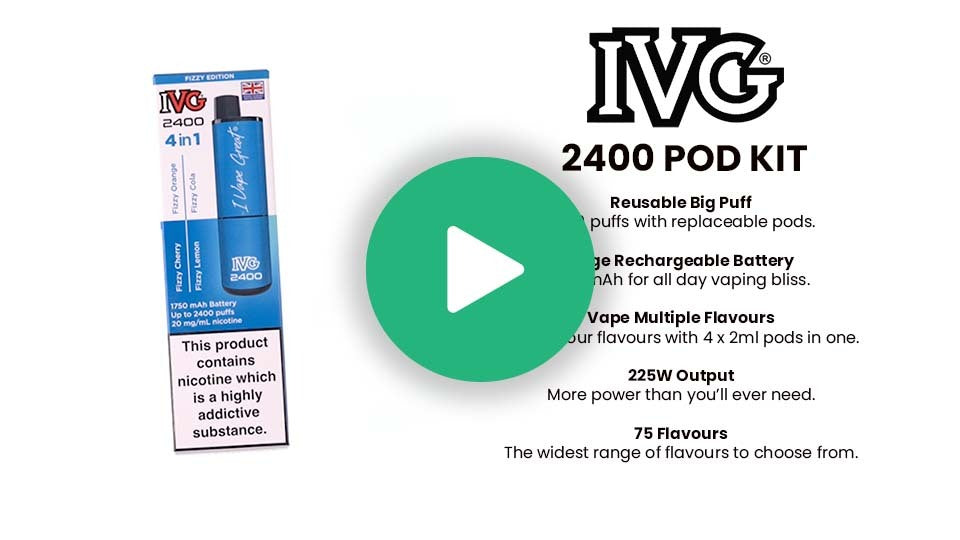 The IVG 2400 Prefilled Pod Kit is a rechargeable alternative to the IVG 2400 disposable, designed for vapers who want the same great flavours in a more sustainable format. It uses a 1750mAh built in battery and four 2ml prefilled pods, giving you up to 2400 puffs per kit. Each pod comes filled with 20mg IVG nic salt, so you can expect a smooth MTL draw with fast craving relief.