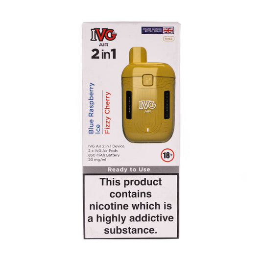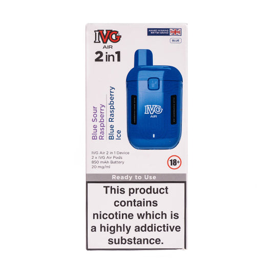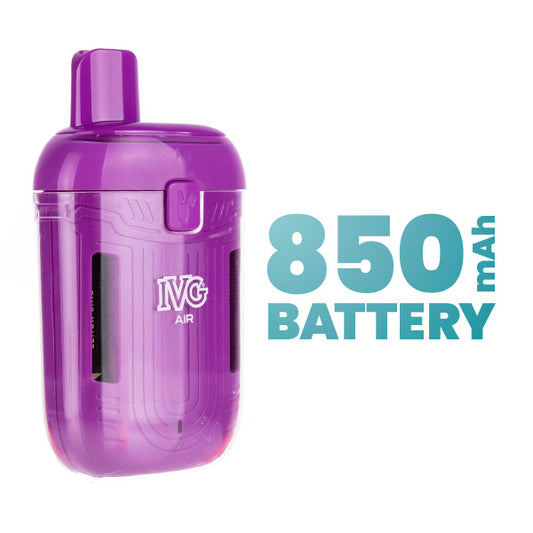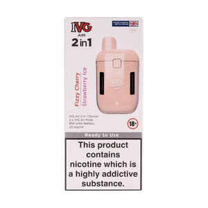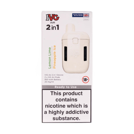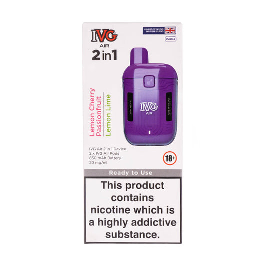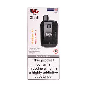 The IVG Air 2-in-1 Pod Kit is a compact and user-friendly prefilled pod system designed for convenience and versatility. It features an ergonomic design housing an 850mAh battery, providing several hours of use before needing a recharge via a Type-C cable (not included). The innovative design allows for two IVG Air pods to be inserted simultaneously, enabling users to switch between flavours with a simple twist.