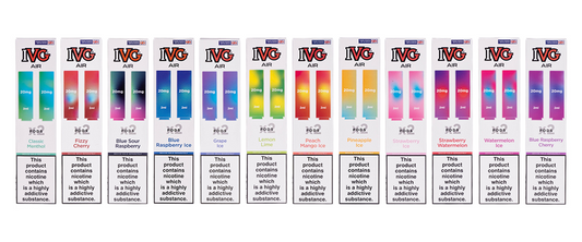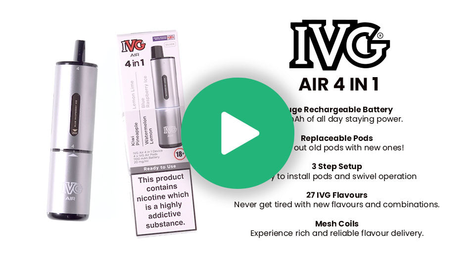 The IVG Air 4 in 1 Pod Kit is a rechargeable version of the IVG 2400, designed for vapers who want the same bold flavours in a more economical, reusable format. It pairs a long lasting 1100mAh battery with four interchangeable 2ml prefilled pods, giving you up to 2400 puffs per device in a compact MTL kit.