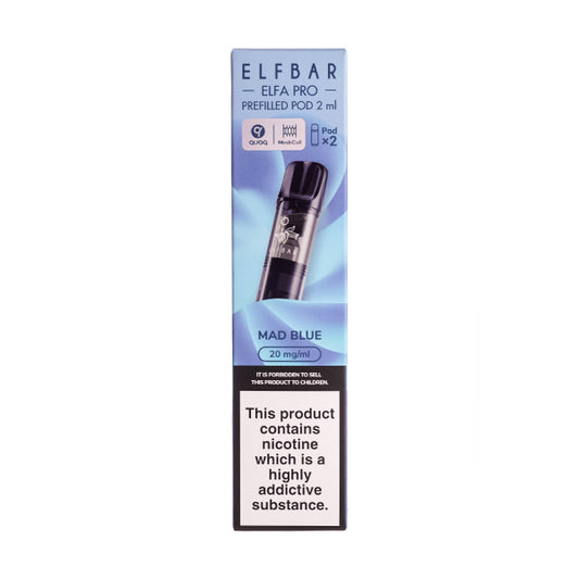 The Elf Bar Mad Blue Prefilled Pods are designed for use with the Elf Bar Elfa Pro pod kit only. The Mad Blue ELFA Pro pods deliver a blend of raspberries, blueberries and blackberries for a vibrant sweet vape.