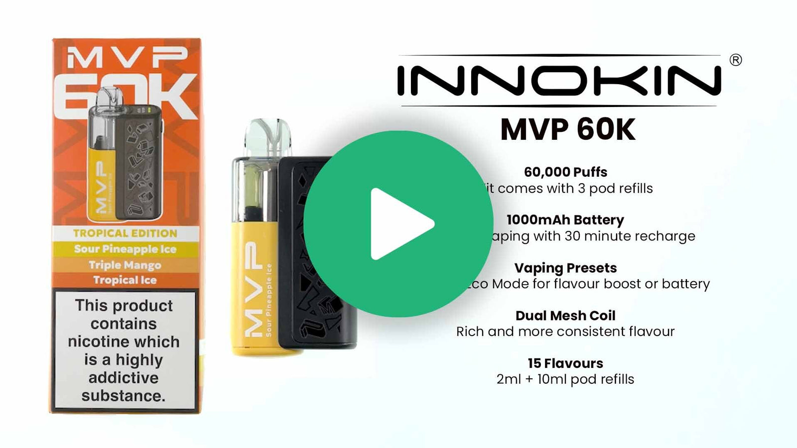 The MVP 60K Prefilled Pod Kit is a high capacity prefilled system developed with Innokin, designed for vapers who want long lasting performance with simple controls. It uses a 1000mAh rechargeable battery, inhale activation and dual mesh prefilled pods to deliver an MTL style vape with clear flavour and smooth vapour.
