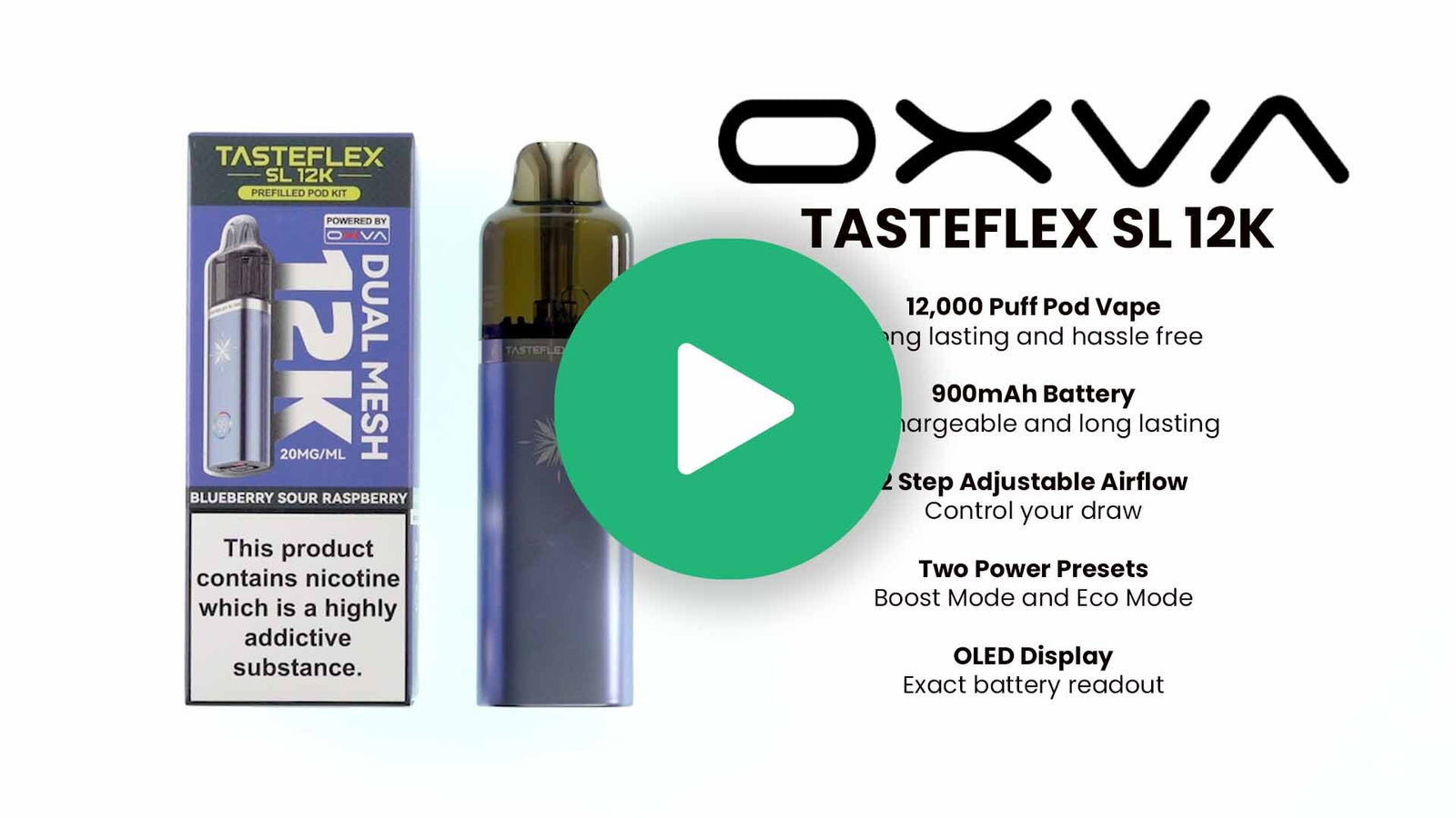 The OXVA Tasteflex SL 12K is a sleek prefilled pod kit built for long sessions and low effort. A 900mAh rechargeable battery and two power modes keep it going through a busy day. Designed for MTL style vaping, the kit uses a 2ml prefilled pod paired with a 10ml refill container, giving you 12ml in total and up to 12,000 puffs. The circular OLED screen shows the essentials at a glance, while adjustable airflow lets you set a tight or looser draw to suit your taste.
