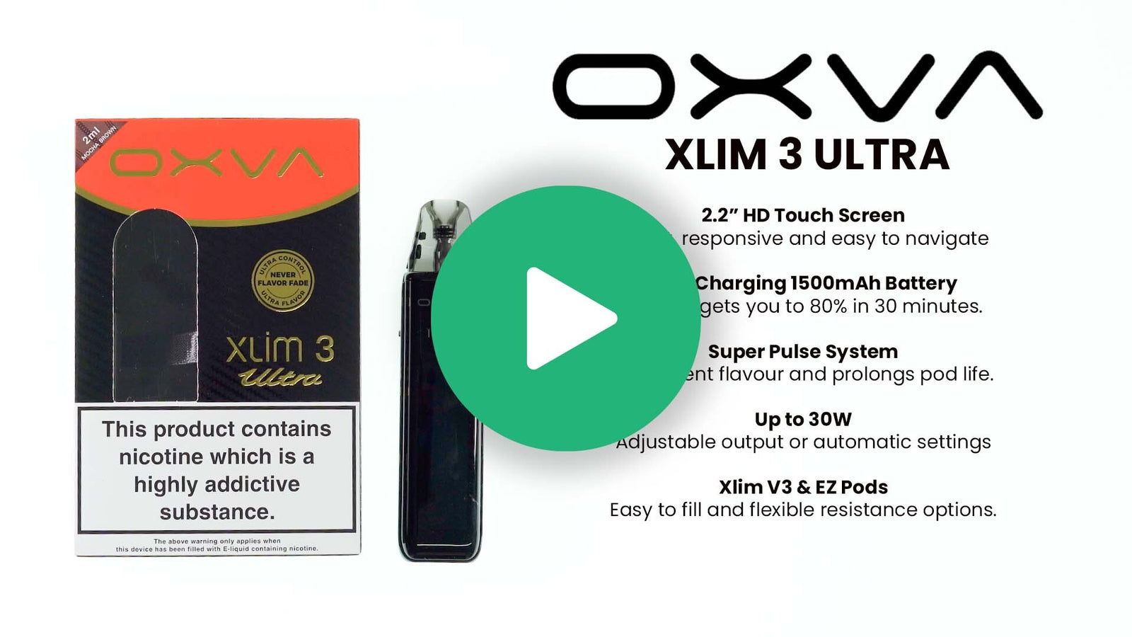 Experience the next level of pod vaping with the OXVA Xlim 3 Ultra. Featuring a 1500mAh battery, 2.2" HD touch screen, 30W max output, 50-minute fast USB-C charging, and full compatibility with all Xlim and EZ pods, this pod vape kit delivers powerful, personalised performance with rich, consistent flavour every time.