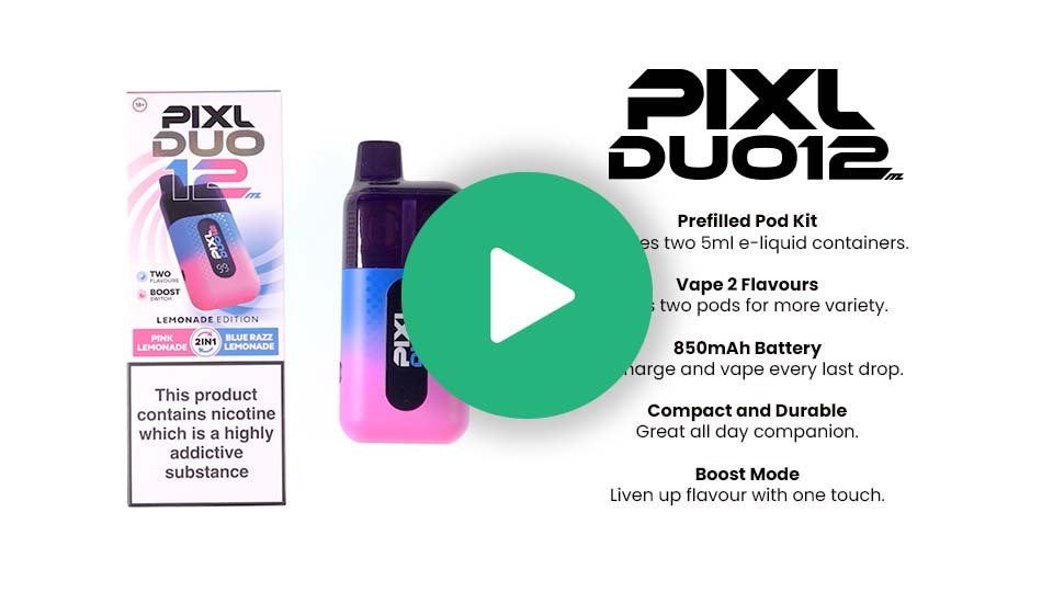 Elevate your vaping experience with the Pixl Duo 12 Vape Kit, crafted for ultimate convenience and performance. This versatile kit includes two 5ml e-liquid containers and an 850mAh rechargeable battery, offering up to 6000 puffs per device.