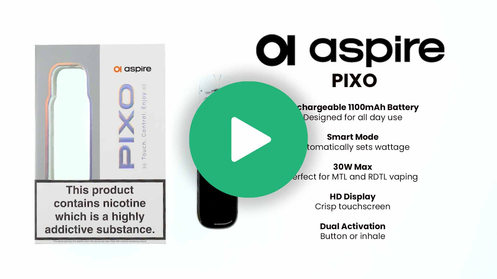 The Aspire Pixo Pod Kit is a simple but capable refillable device for MTL, RDTL and DTL vaping. It uses an internal 1100mAh battery and adjustable power from 5 to 30W, so you can tailor the vape to your preferred style. If you do not want to adjust settings, Smart Mode can set the wattage automatically based on the pod you use.