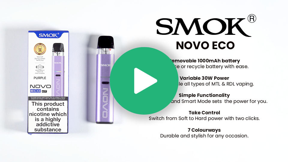 The SMOK Novo Eco Pod Kit packs big performance into a compact, sustainable design. Powered by a 1000mAh removable battery, this refillable pod device delivers up to 30W output, supports both MTL and RDTL vaping, and features auto-inhale activation - making it ideal for everyday use and for those switching from disposables. When the battery reaches the end of its lifespan, you can simply remove and recycle it, making the Novo Eco a cleaner, longer-lasting alternative to traditional pod kits. Lightweight, stylish, and smart, it’s built for convenience without compromise.