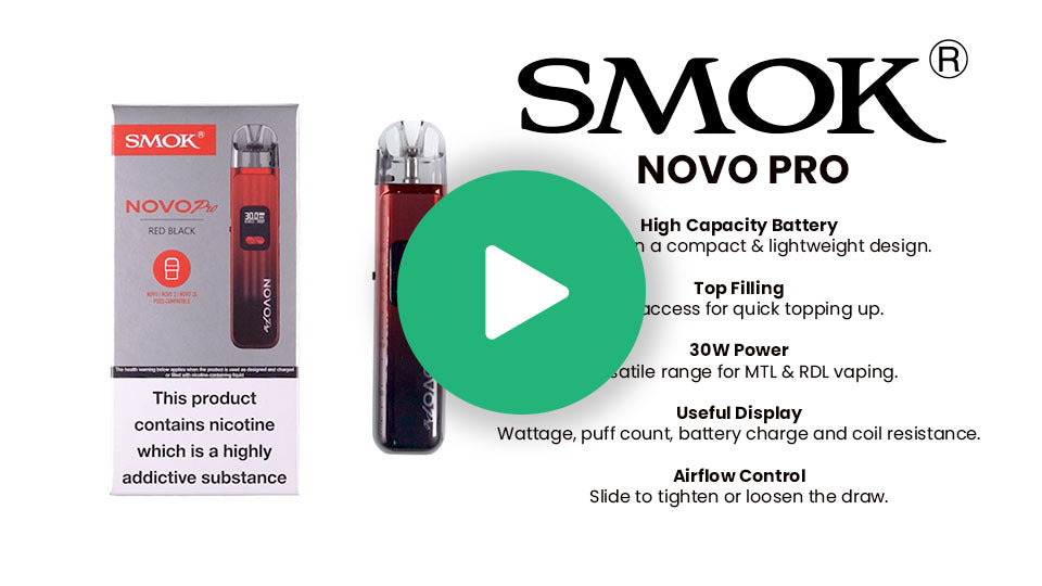 Discover the SMOK Novo Pro pod kit, a 30W refillable vape with a 1300mAh battery, dual activation and stepless airflow. A stylish option for mouth-to-lung (MTL) vaping, the Novo Pro uses top refilling pods and a wide selection of coil resistance options with the Novo pod series.