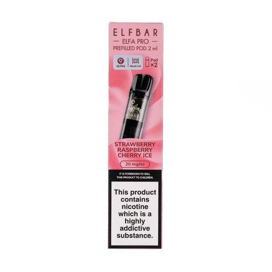 The Elf Bar Strawberry Raspberry Cherry Ice Prefilled Pods are designed for use with the Elf Bar Elfa Pro pod kit only. Enjoy a balanced blend of fresh summer strawberries, tangy raspberries and rich cherry tones rounded off with an icy breeze.
