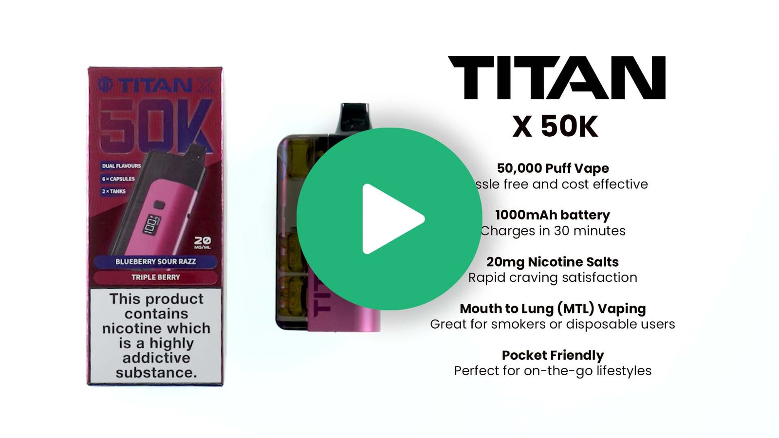 The Titan X 50K Prefilled Pod Kit delivers five times the amount of puffs (50,000) as the original device, it includes 2 x 2ml pods and 6 x 5ml refills, all loaded with 20mg of nicotine salt for fast craving satisfaction. It is compatible with all existing Titan X pods, so you can enjoy a wide selection, with mesh coil consistency and immaculate flavour. The 1000mAh battery and Type-C charging capability will ensure you go back to full power in just thirty minutes.