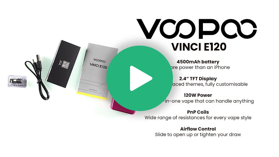 The VooPoo Vinci E120 effortlessly combines class and performance. Its luxury dial can be customised to fit your individual preference. With a high-density 4500mAh battery, the Vinci E120 offers an impressive 120W output, delivering an exceptional Direct-to-Lung (DTL) vaping experience. Experience maximum flavour throughout your whole vaping journey with the PnP X coils used in this device.