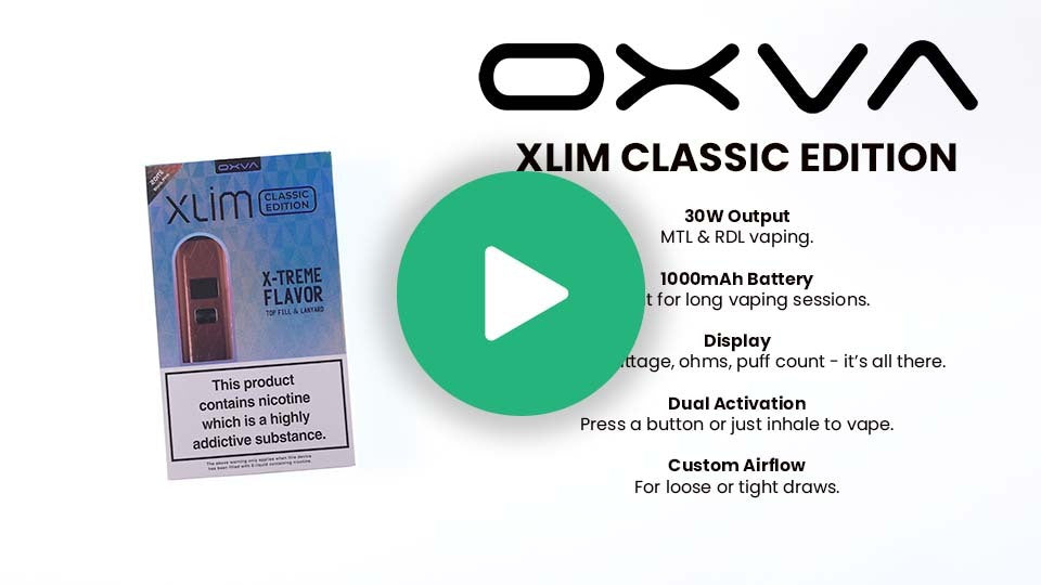 The OXVA Xlim Classic is a compact refillable pod kit made for simple, reliable everyday vaping. A 1000mAh built-in battery and adjustable power up to 25W give you steady performance in a slim, lightweight body. You can vape by pressing the button or just inhaling. USB-C fast charging keeps downtime low, while a side airflow slider lets you set a tighter MTL draw or a looser RDL inhale.