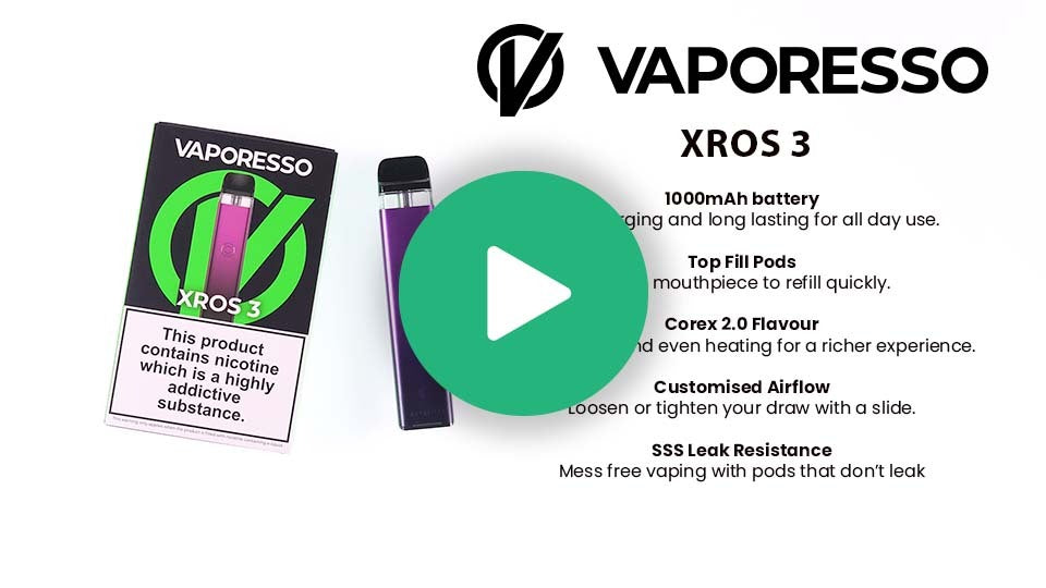 The Vaporesso XROS 3 is a compact refillable pod kit built for everyday use. A 1000mAh high-density battery provides reliable power through the day and recharges quickly via USB-C. The 2ml XROS top-fill pods use COREX mesh heating for fast ramp up and clean, consistent flavour, while SSS leak resistance helps keep pockets mess free. An airflow slider on the side lets you set a tight MTL draw or a looser RDTL inhale, and you can vape by pressing the button or simply inhaling.
