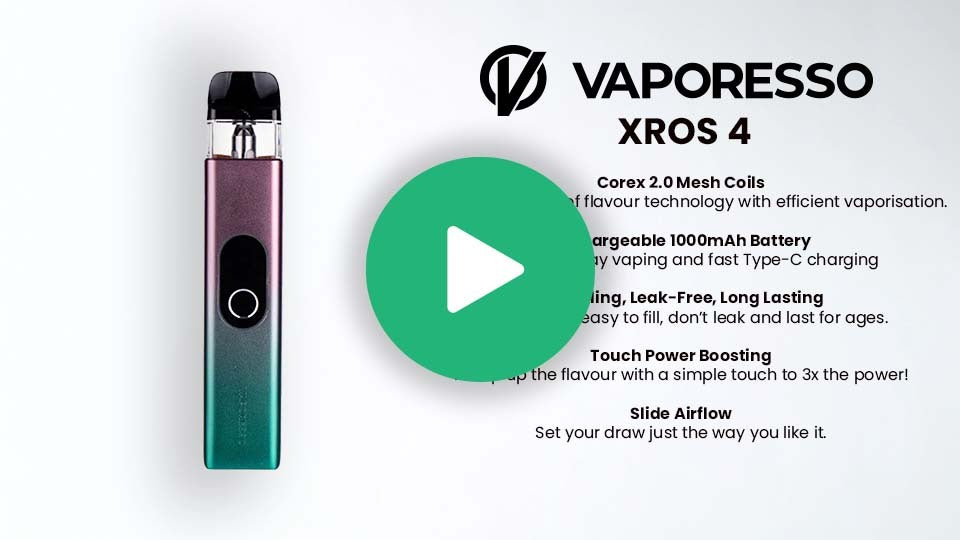 The Vaporesso XROS 4 is a sleek, refillable pod kit that keeps things simple while delivering clean flavour. A 1000mAh battery handles a full day for most users and recharges in about 30 minutes via 2A USB-C. An airflow slider lets you set a tight MTL draw or a looser RDTL inhale. Three power settings (Strong, Stronger, Strongest) make it easy to fine-tune the draw, and a clear colour display shows battery level and mode at a glance.